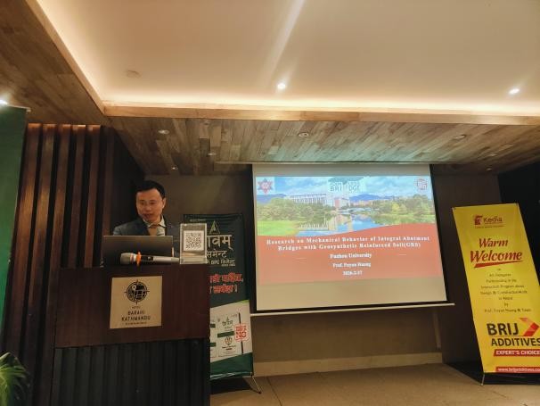 On the afternoon of the same day, the delegation visited the Nepal Academy of Science and Technology (NAST) and met with Professor Dilip Subba, Vice-President of NAST, and other researchers. Professor Huang Fuyun delivered an academic report, sharing the latest achievements of the college in the research, popularization and application of the mechanical performance of integral jointless bridges, which stimulated enthusiastic discussions. In the evening, the delegation was invited to an exchange event co-organized by the Development Cooperation Implementation Division of Nepal’s Department of Roads and Tribhuvan University. Representatives from the Nepal Branch of China Railway No.2 Engineering Group International Co., Ltd. and the local construction industry also attended the event. The delegation exchanged views with Dr. Bijaya Jaishi, an alumnus of Fuzhou University and Deputy Director-General of the Development Cooperation Implementation Division of Nepal’s Department of Roads. Professors Yuan Huihui and Huang Fuyun gave academic presentations respectively, sharing research findings in the fields of steel-concrete composite structures and jointless bridges in light of the actual needs of engineering construction in Nepal, providing technical references for local engineering practice.